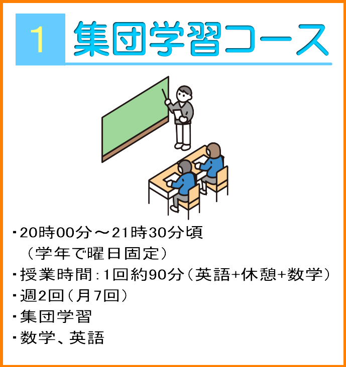 ①集団学習コース:平日の20時から21時30分の90分間。